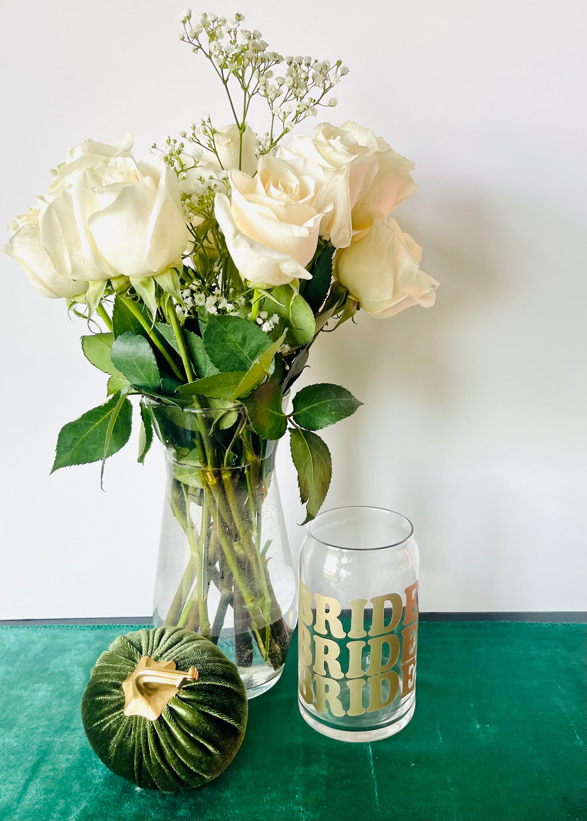 This unique glass can cup features a fun design with a bride vinyl print. This glass cup is a treat for you or your bride and will make an ideal addition to any bachelorette party, wedding day, or any other wedding event. Durable and stylish, this cup is the perfect treat-yo-self gift!