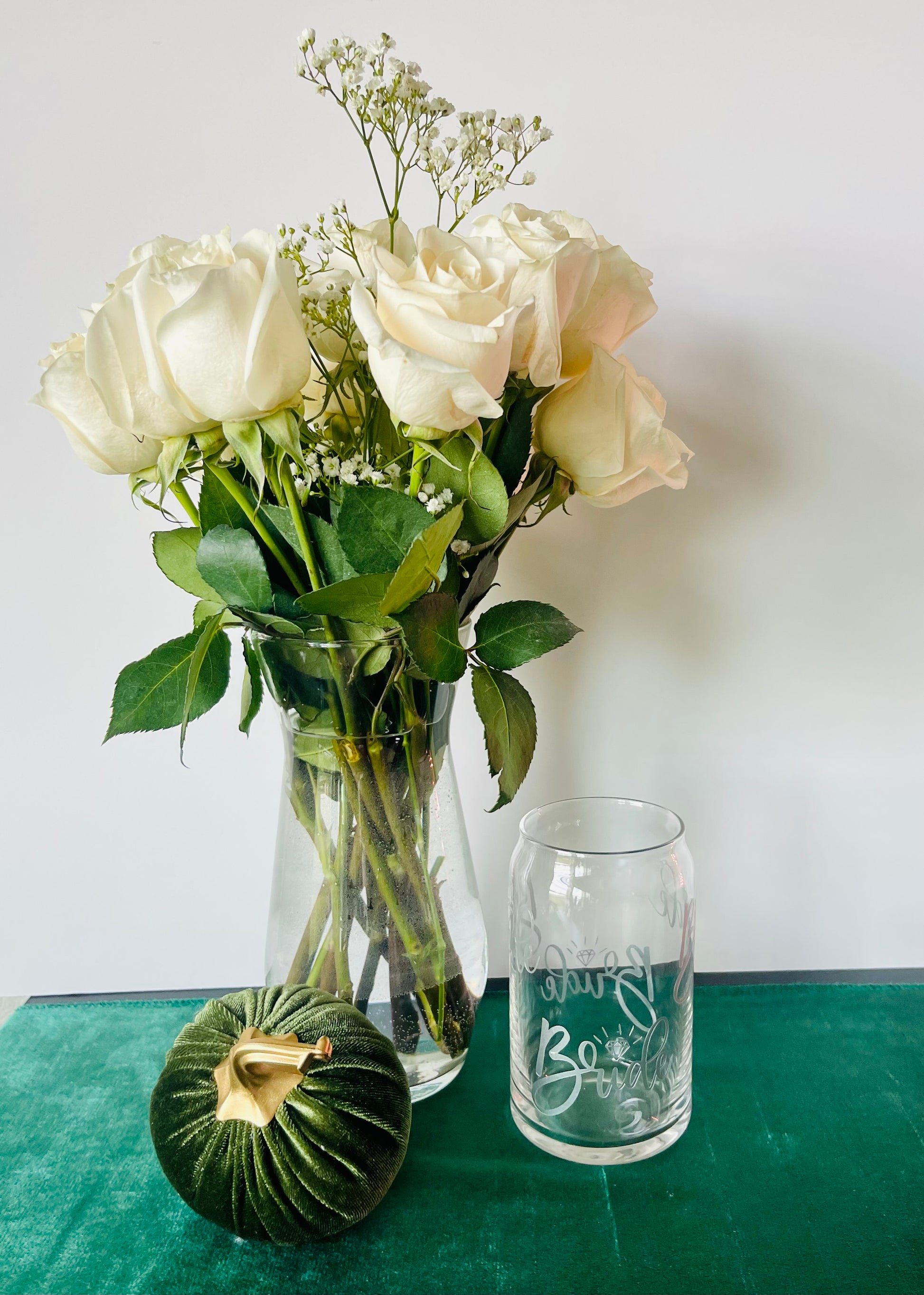This unique cup features an elegant design with a bride vinyl print surrounding the glass. This glass cup is a timeless treasure that will make an ideal addition to any celebration, or even to enjoy an iced coffee while wedding planning. Durable and stylish, this cup is the perfect way to toast to your special day.