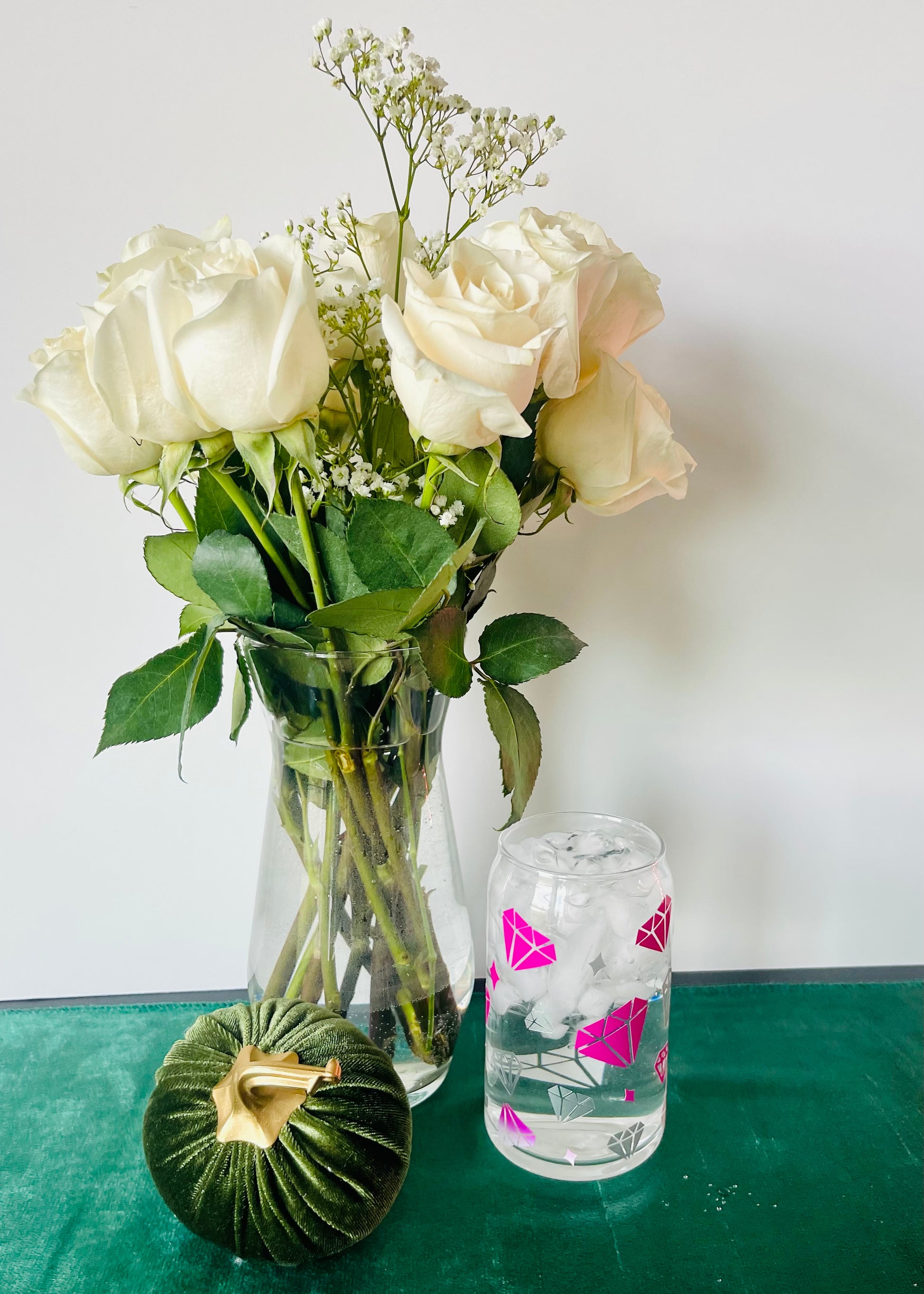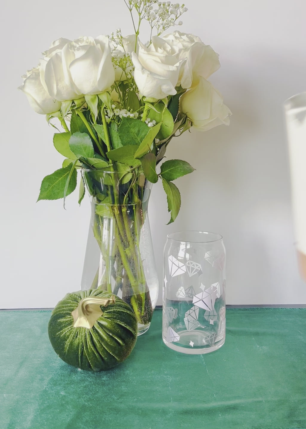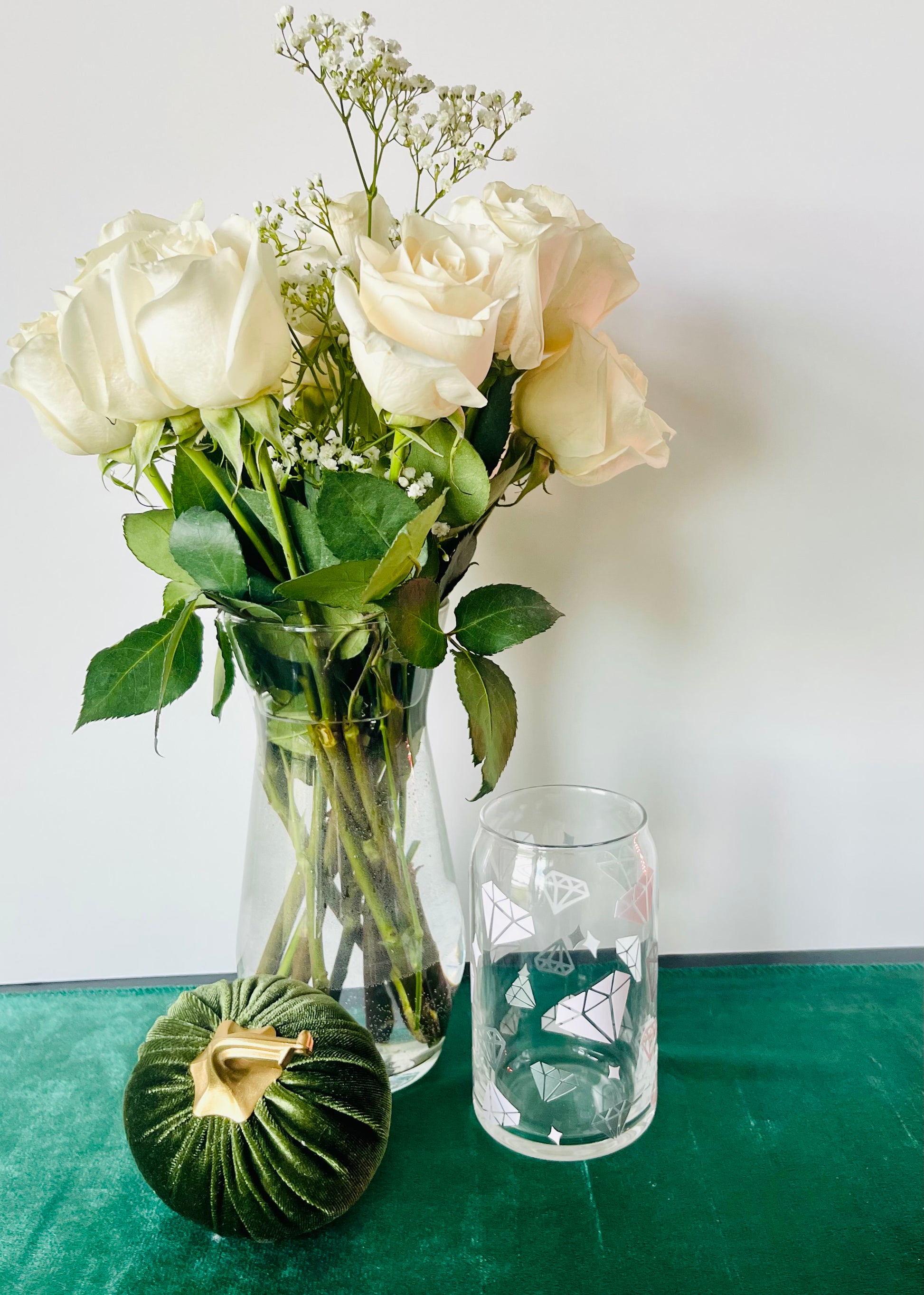 This unique can cup features an elegant design with a diamond vinyl print surrounding the glass. This glass cup is a timeless treasure that will make an ideal addition to any celebration, or even to enjoy an iced coffee while wedding planning. Durable and stylish, this cup is the perfect way to toast to your special day.