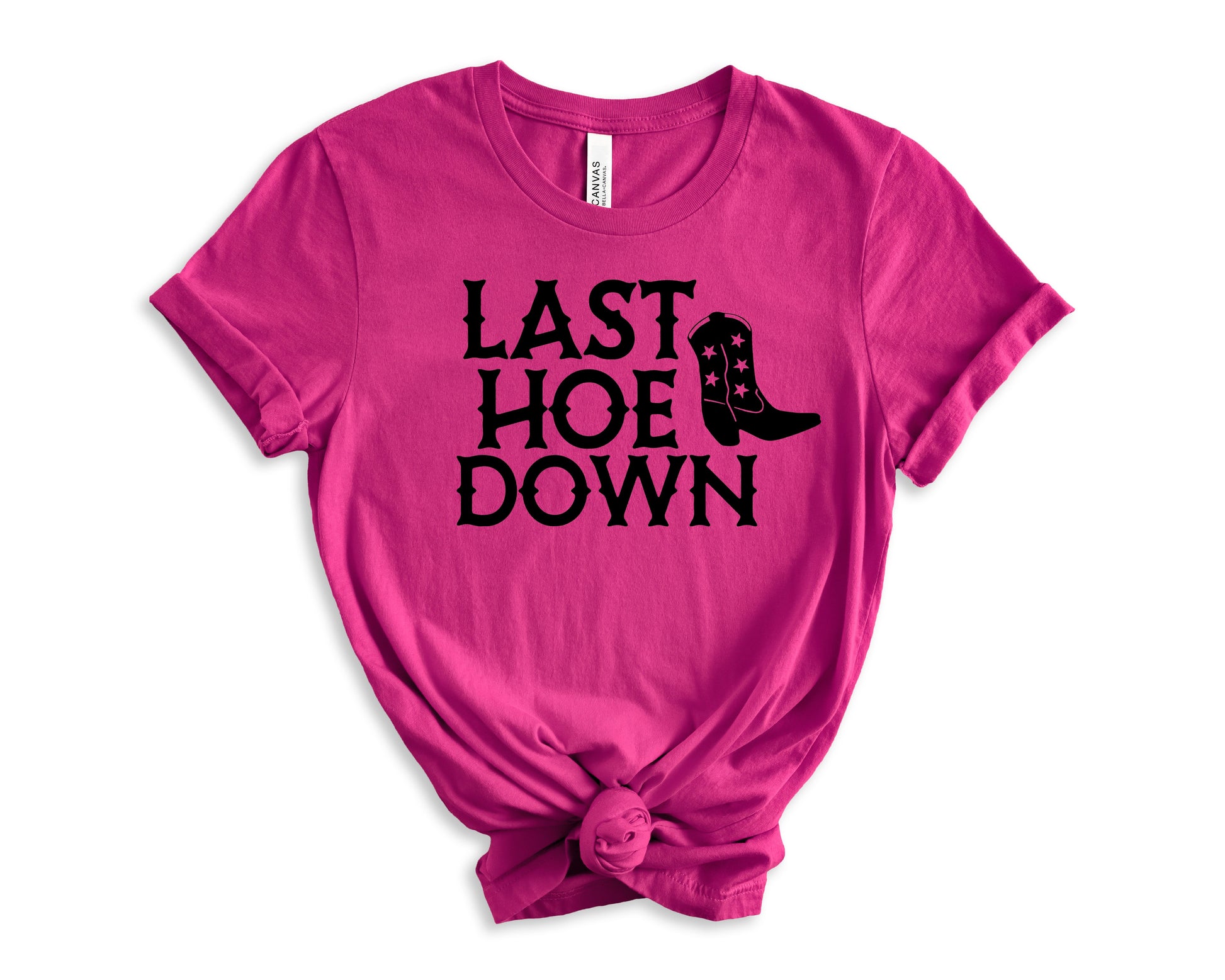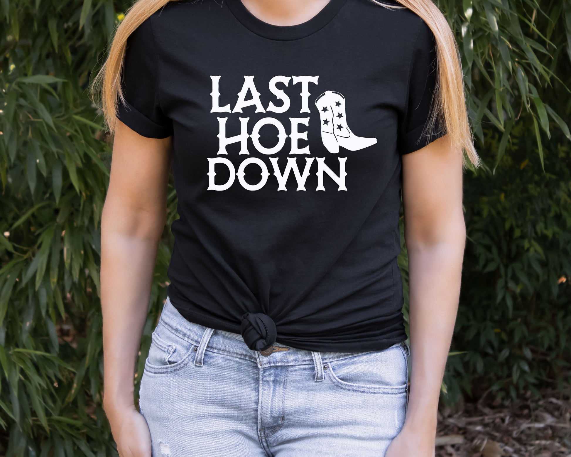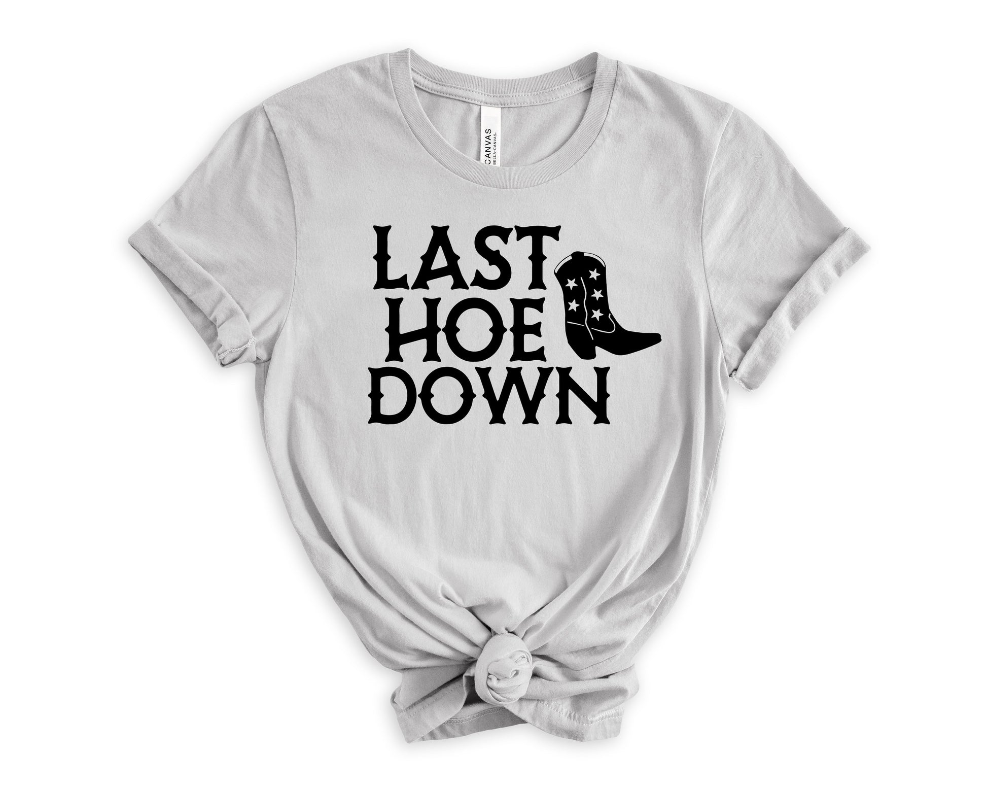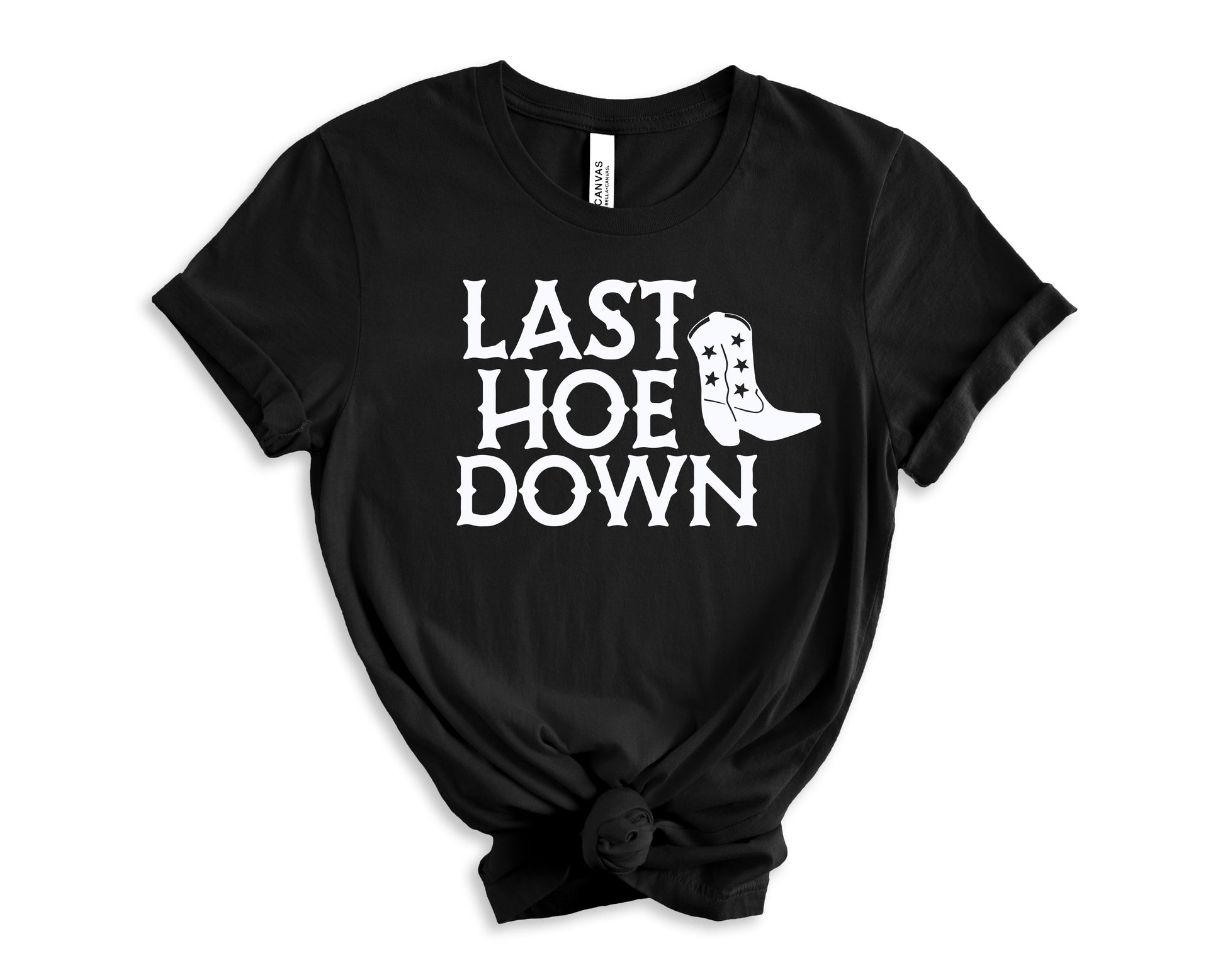 This Last Hoe Down T-Shirt is the perfect match for a bride's gals to wear at her bachelorette party. Featuring a bold worded design and cowgirl boot, this t-shirt is sure to stand out in the crowd. The perfect way to show off your style, and ensure your bride's last hoe down is one to remember.