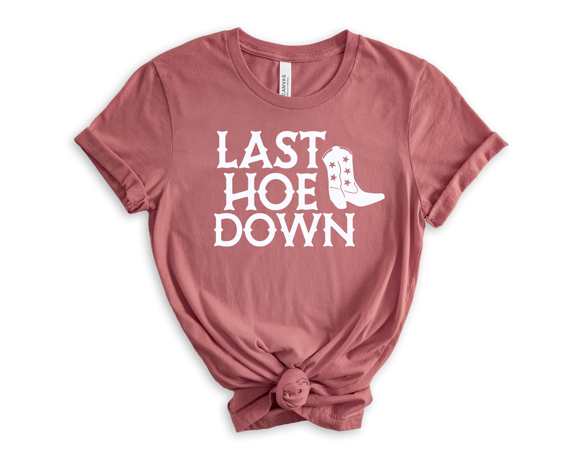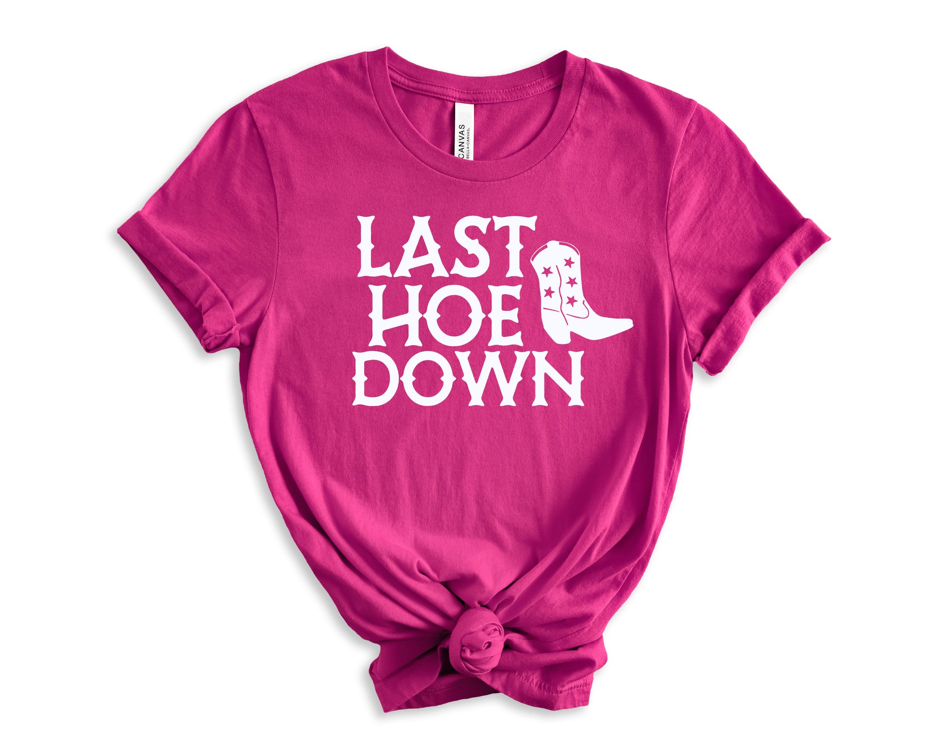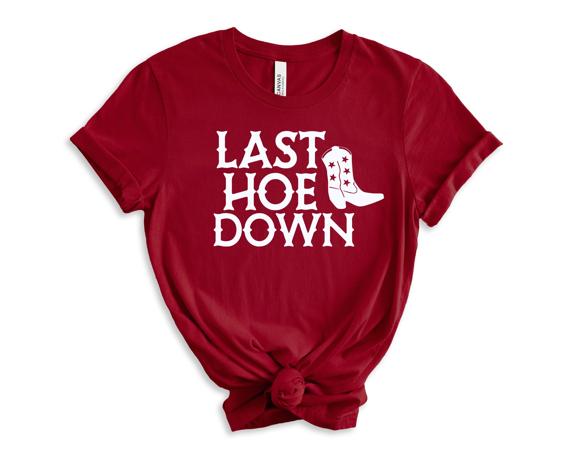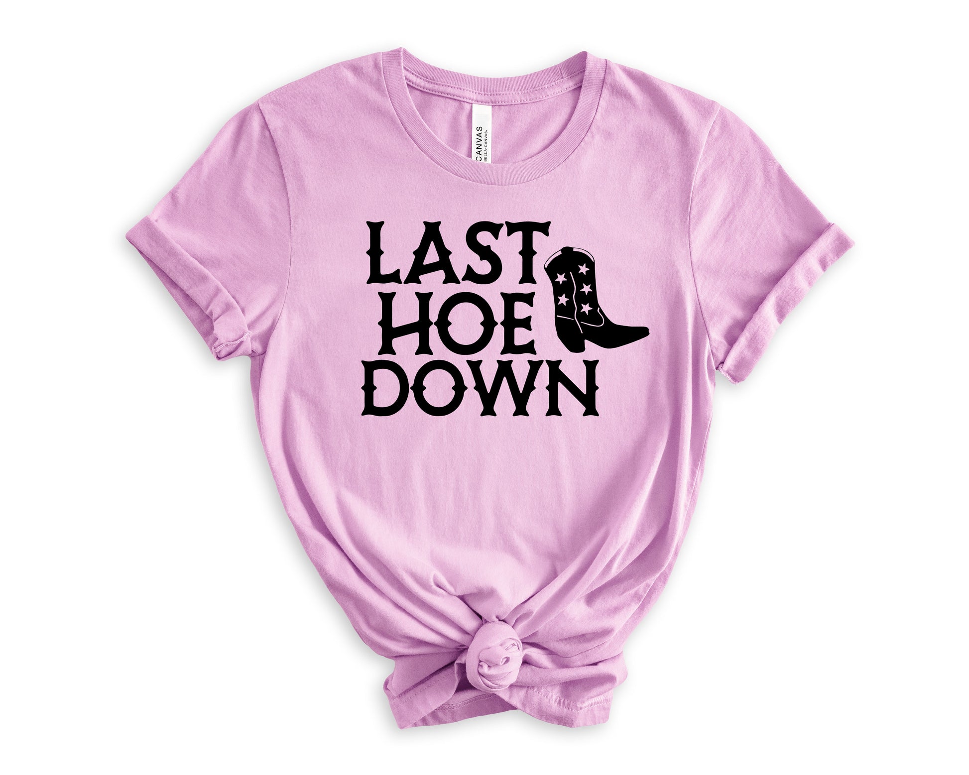 This Last Hoe Down T-Shirt is the perfect match for a bride's gals to wear at her bachelorette party. Featuring a bold worded design and cowgirl boot, this t-shirt is sure to stand out in the crowd. The perfect way to show off your style, and ensure your bride's last hoe down is one to remember.