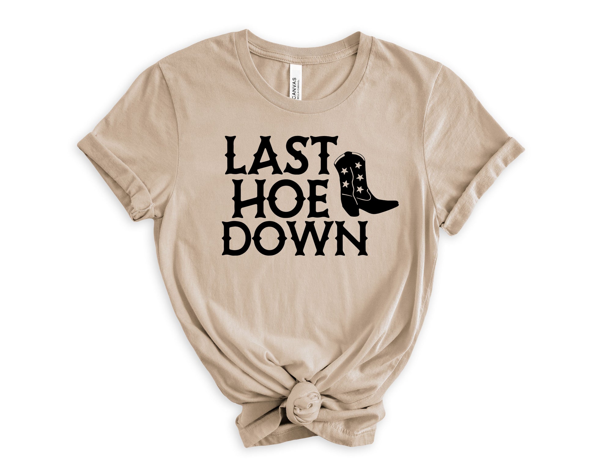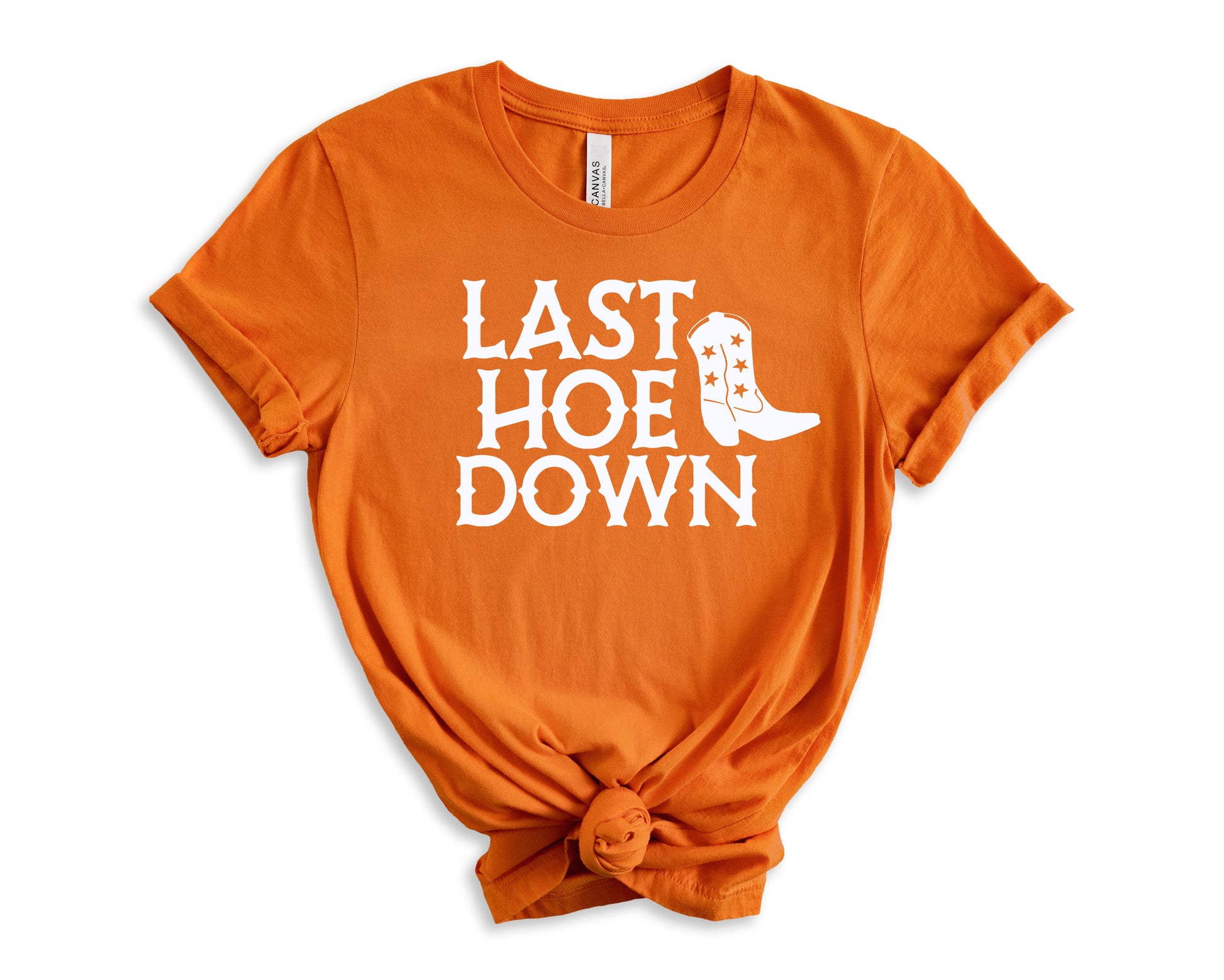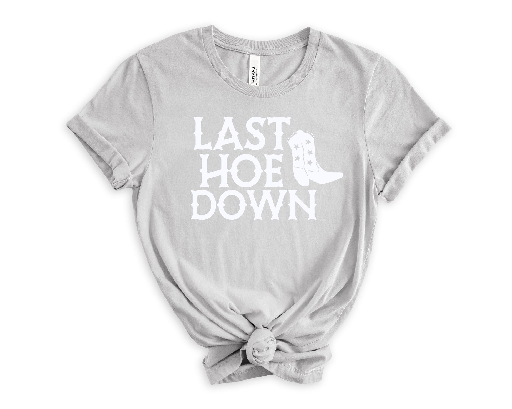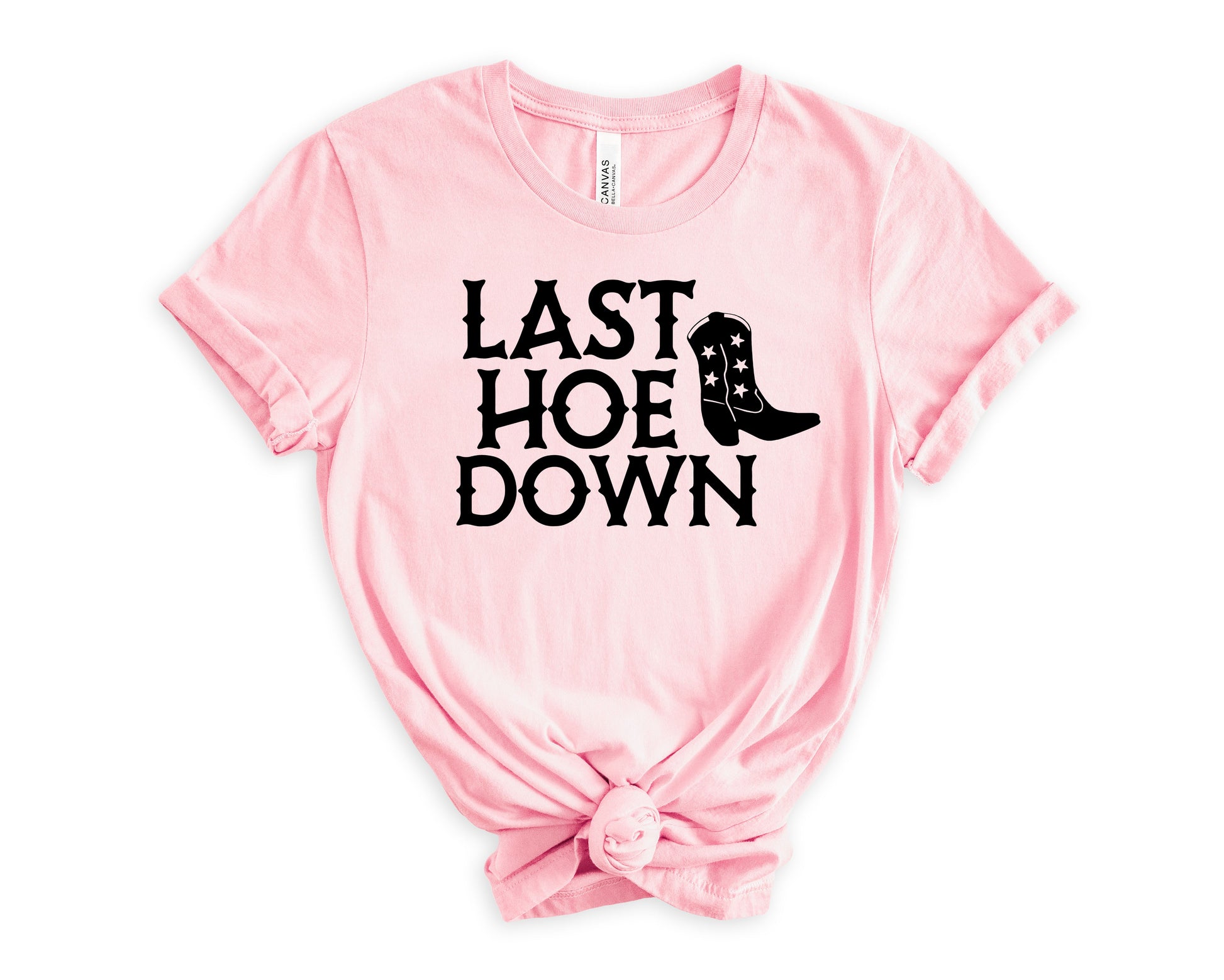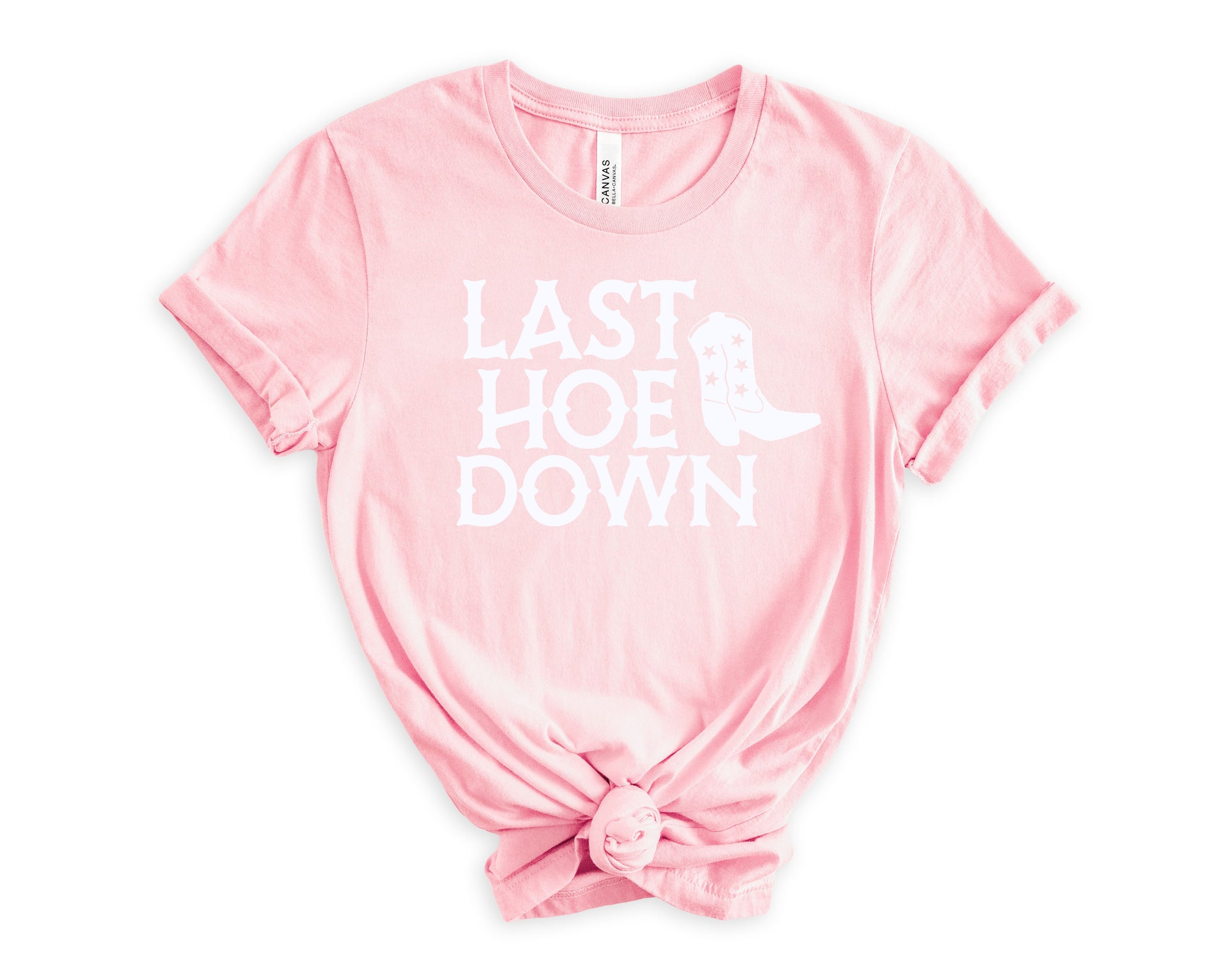 This Last Hoe Down T-Shirt is the perfect match for a bride's gals to wear at her bachelorette party. Featuring a bold worded design and cowgirl boot, this t-shirt is sure to stand out in the crowd. The perfect way to show off your style, and ensure your bride's last hoe down is one to remember.