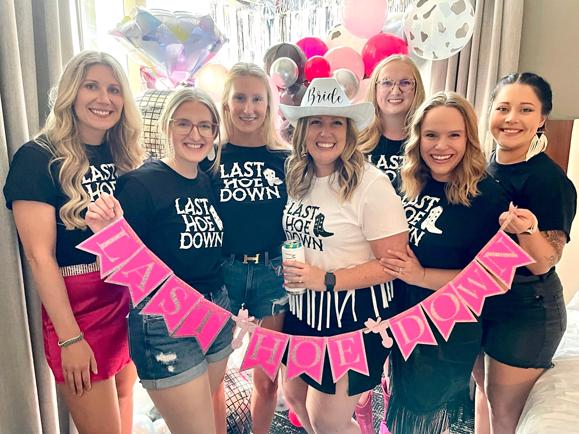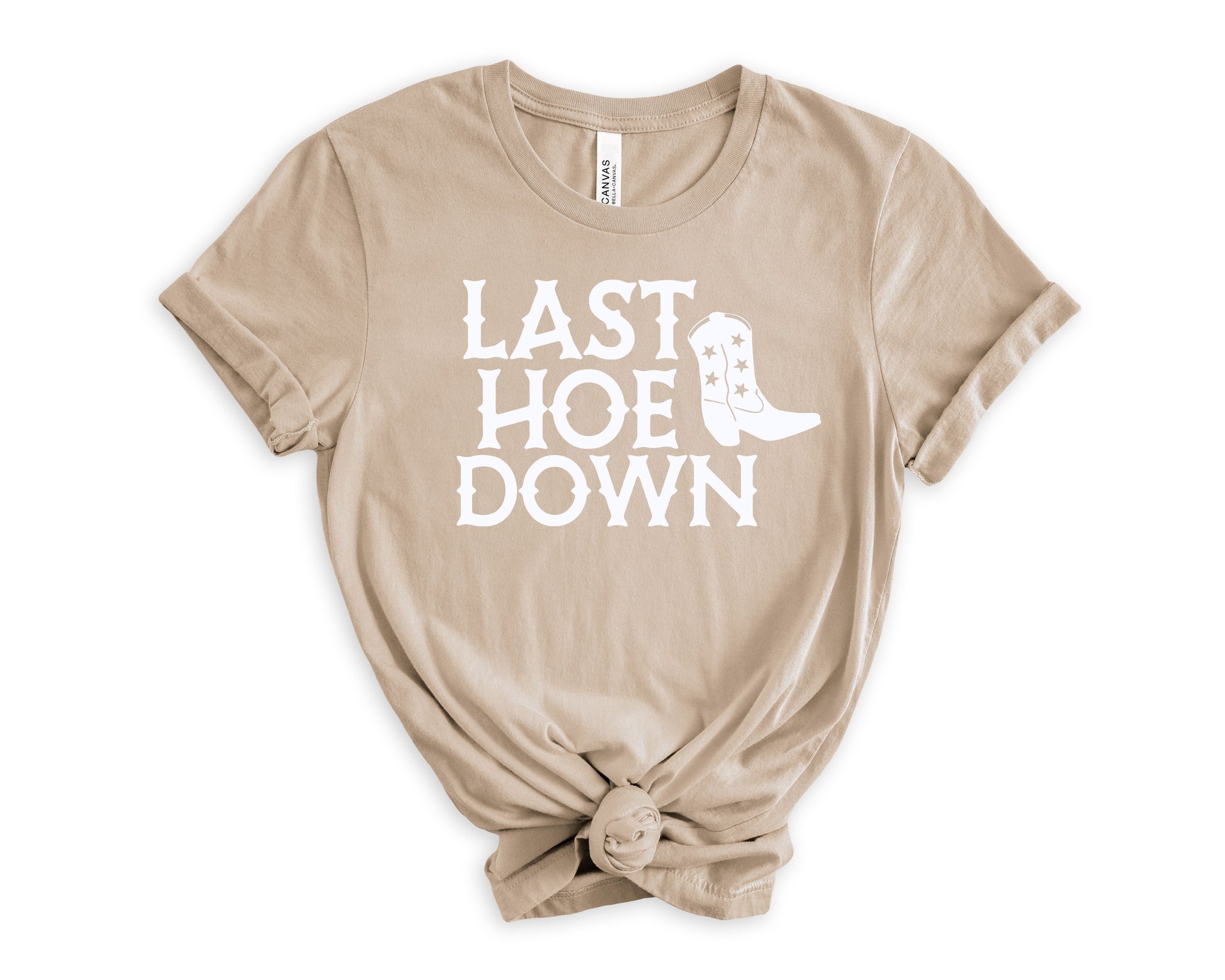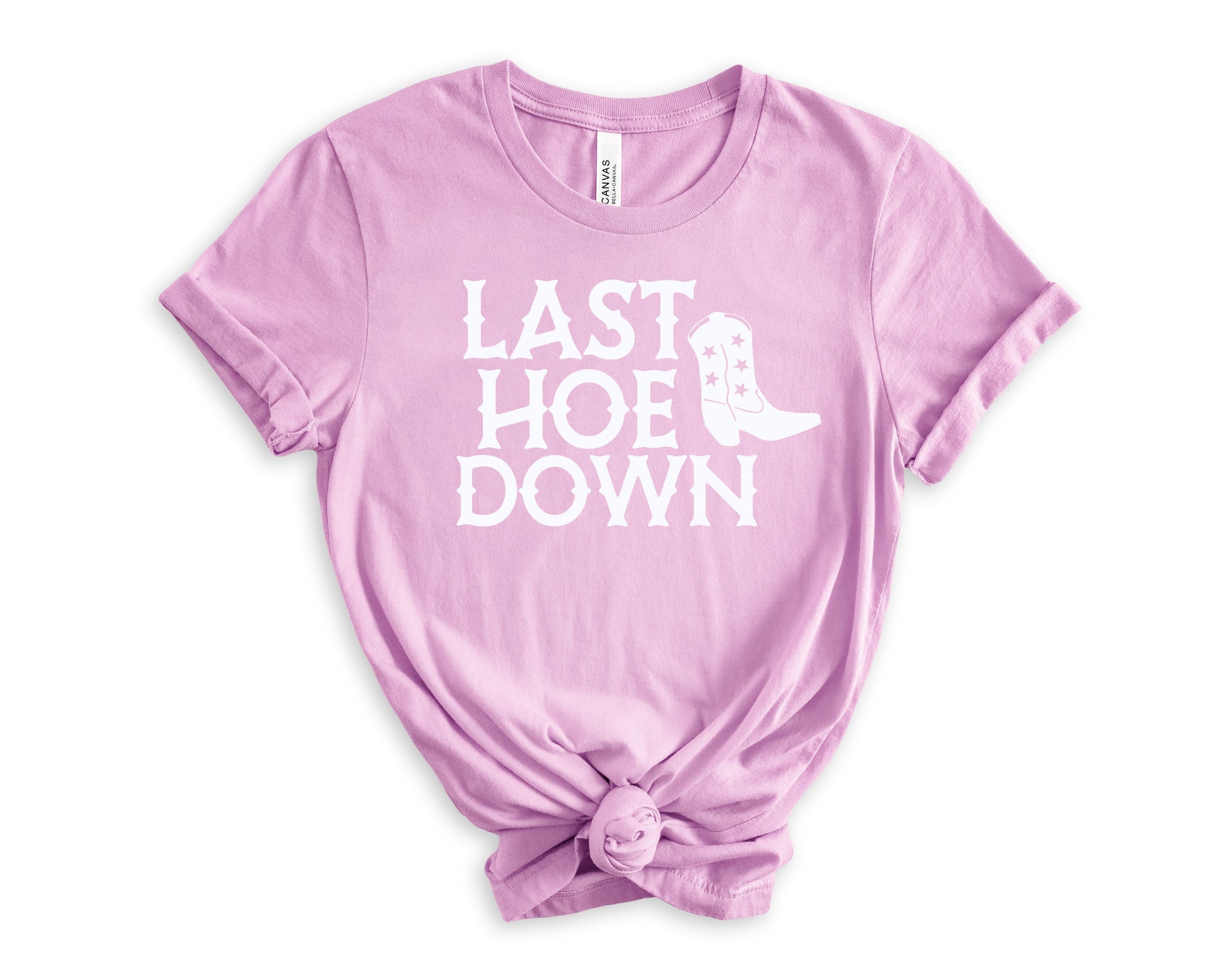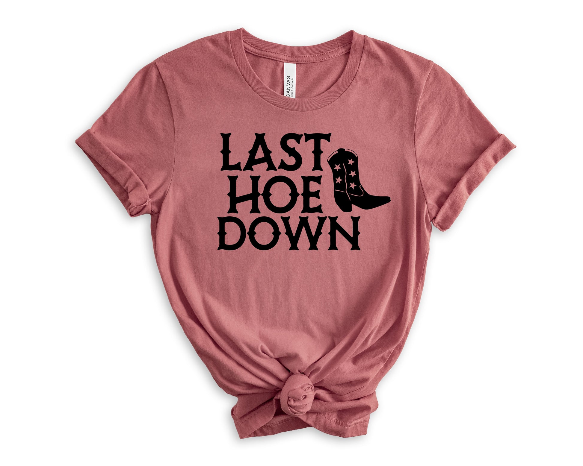This Last Hoe Down T-Shirt is the perfect match for a bride's gals to wear at her bachelorette party. Featuring a bold worded design and cowgirl boot, this t-shirt is sure to stand out in the crowd. The perfect way to show off your style, and ensure your bride's last hoe down is one to remember.