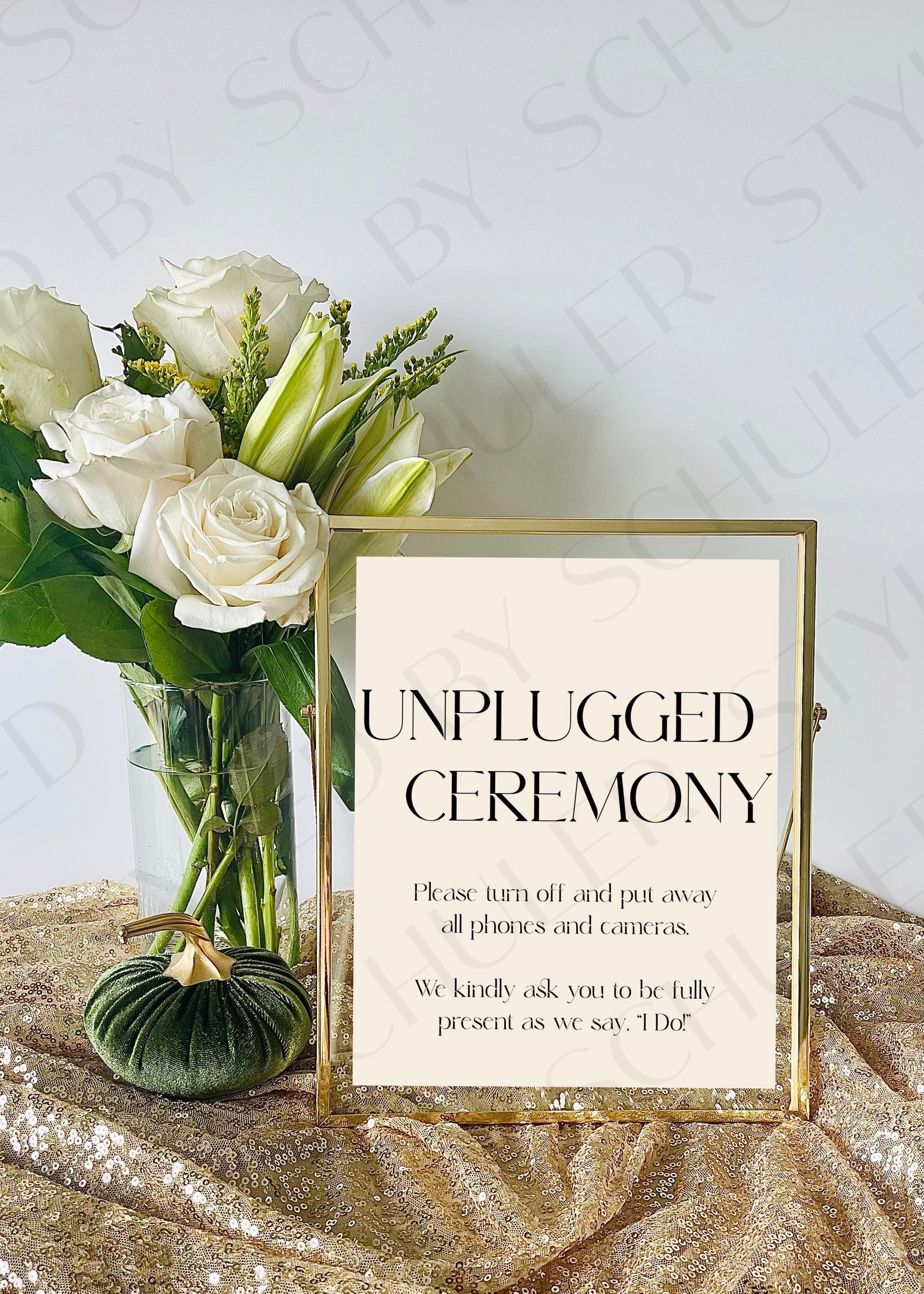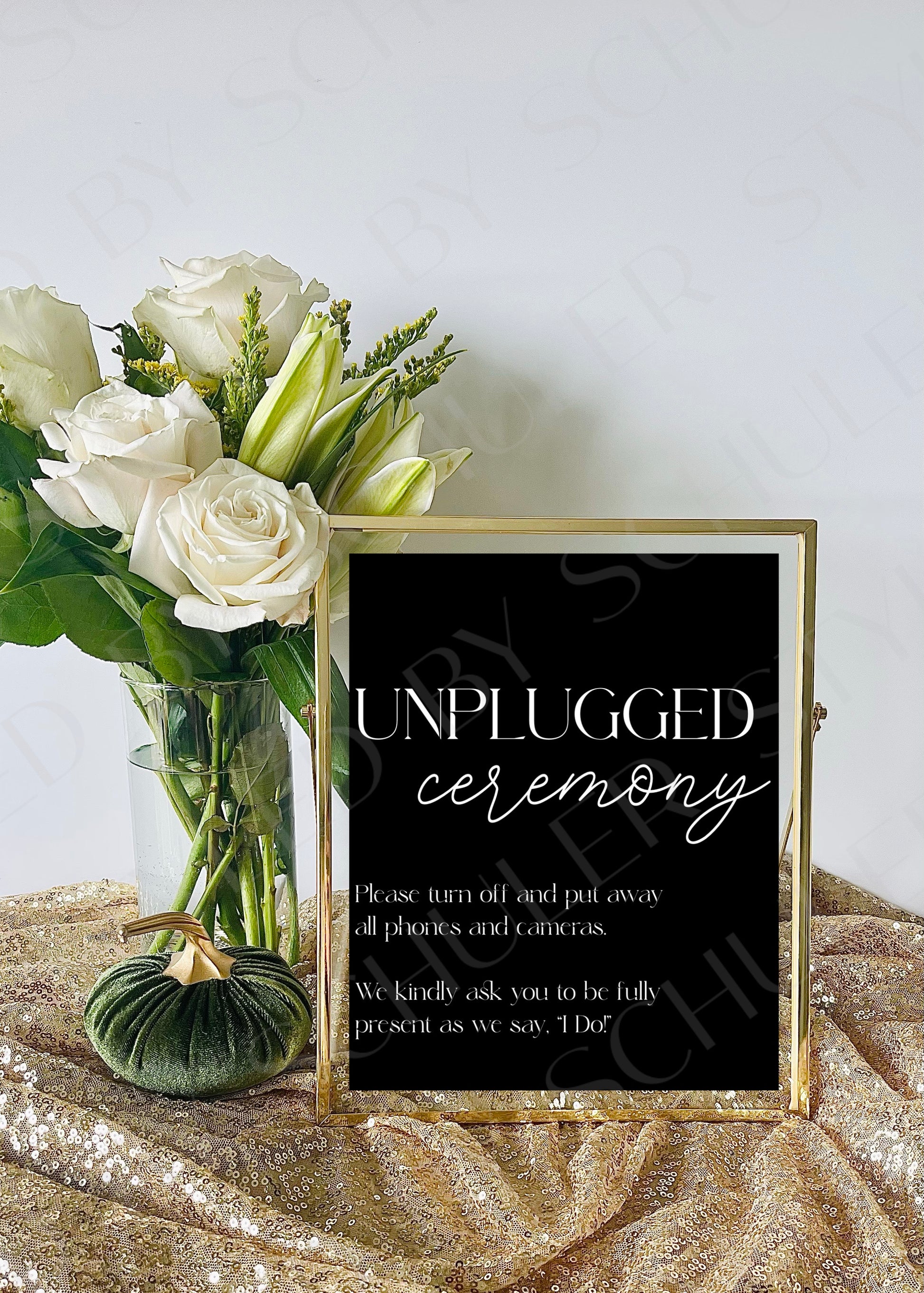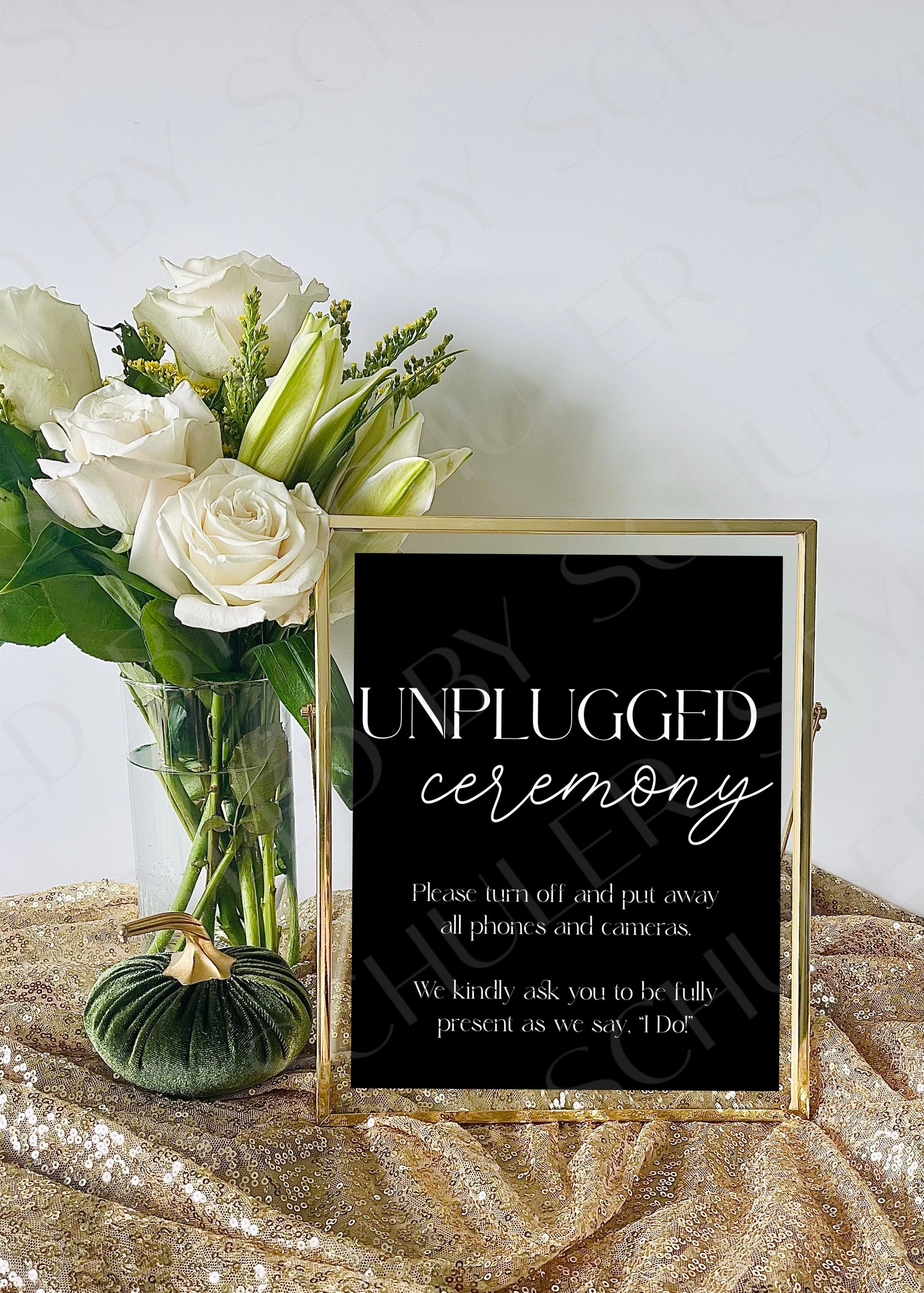 This modern Unplugged Ceremony Sign will provide a professionally designed yet tasteful addition to your wedding ceremony. Eliminate distractions and add a modern touch of elegance to your ceremony with this detailed sign. This is a 8”x10” print professionally printed for the highest quality.