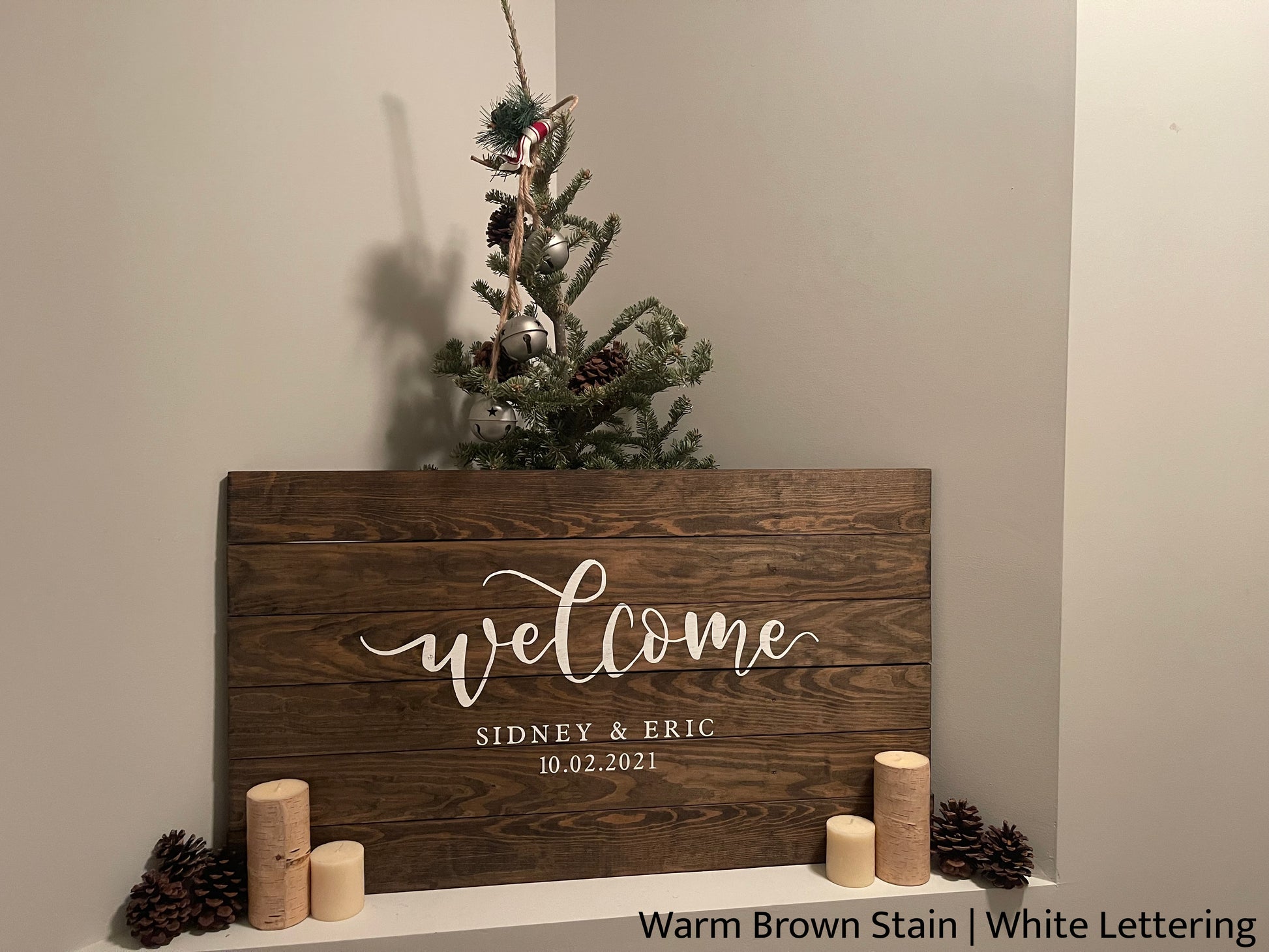 This beautifully stained wood sign is the perfect addition to welcome your guests! Designed to be displayed on an easel or propped against a table, the warm tones of this sign are sure to add simple yet dramatic flair to you day.